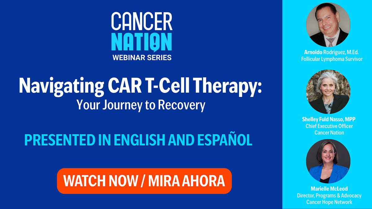 La serie de seminarios web de Cáncer Nation presenta “Navegando la terapia de células T con CAR: su camino hacia la recuperación”, una conversación sobre el recorrido de la terapia de células T con CAR y cómo el tratamiento está brindando nuevas opciones de atención.
